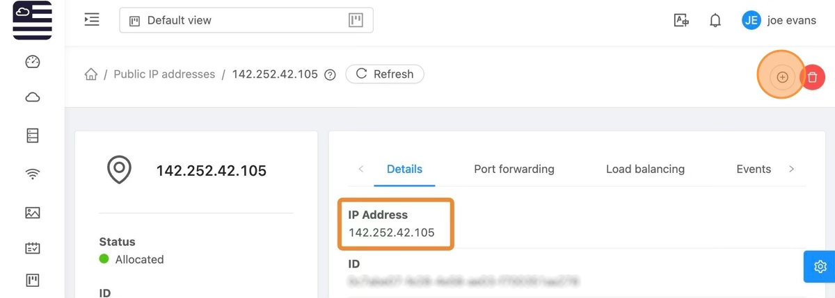 That will bring us to the IP management page. We can assign an IP by selecting the '+' icon in the upper right as depicted.