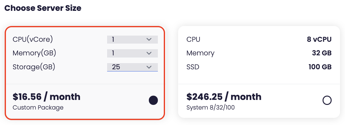 Important: The base template will provide a 25GB root disk no matter the SSD selected. Therefore, only choose a 25GB root disk for pricing purposes. Later in the documentation, more storage will be allocated.