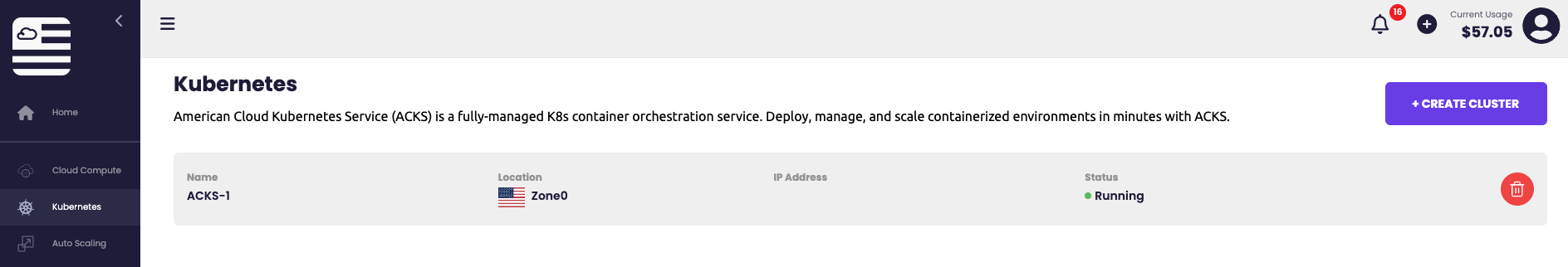 To access your cluster’s kubeconfig, log into your American Cloud account and navigate to Kubernetes under Services.