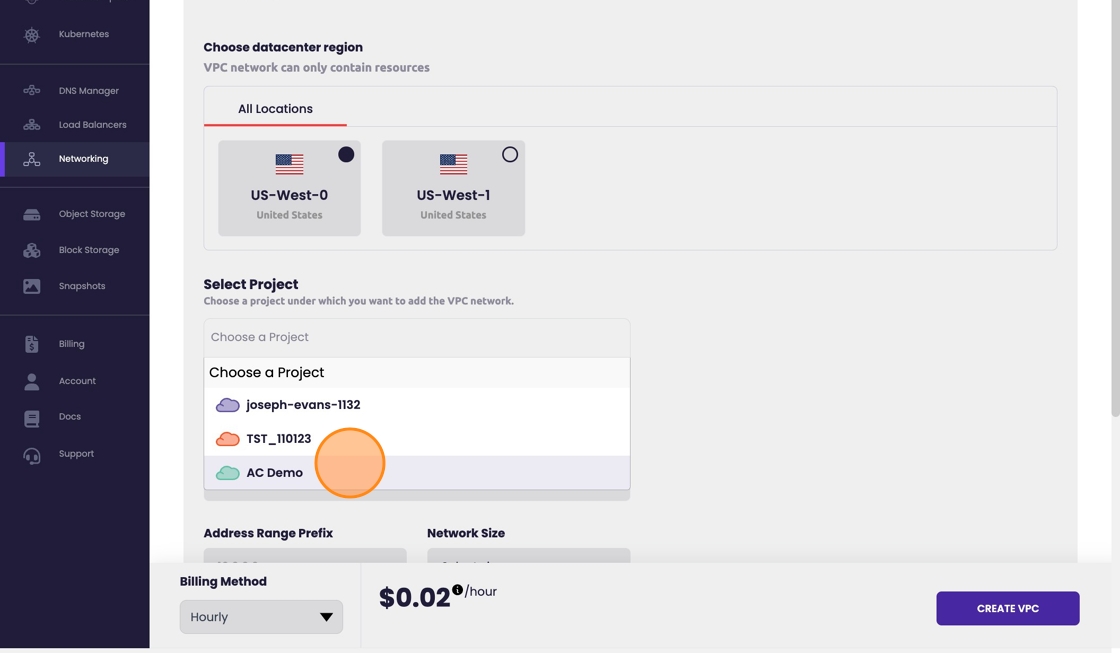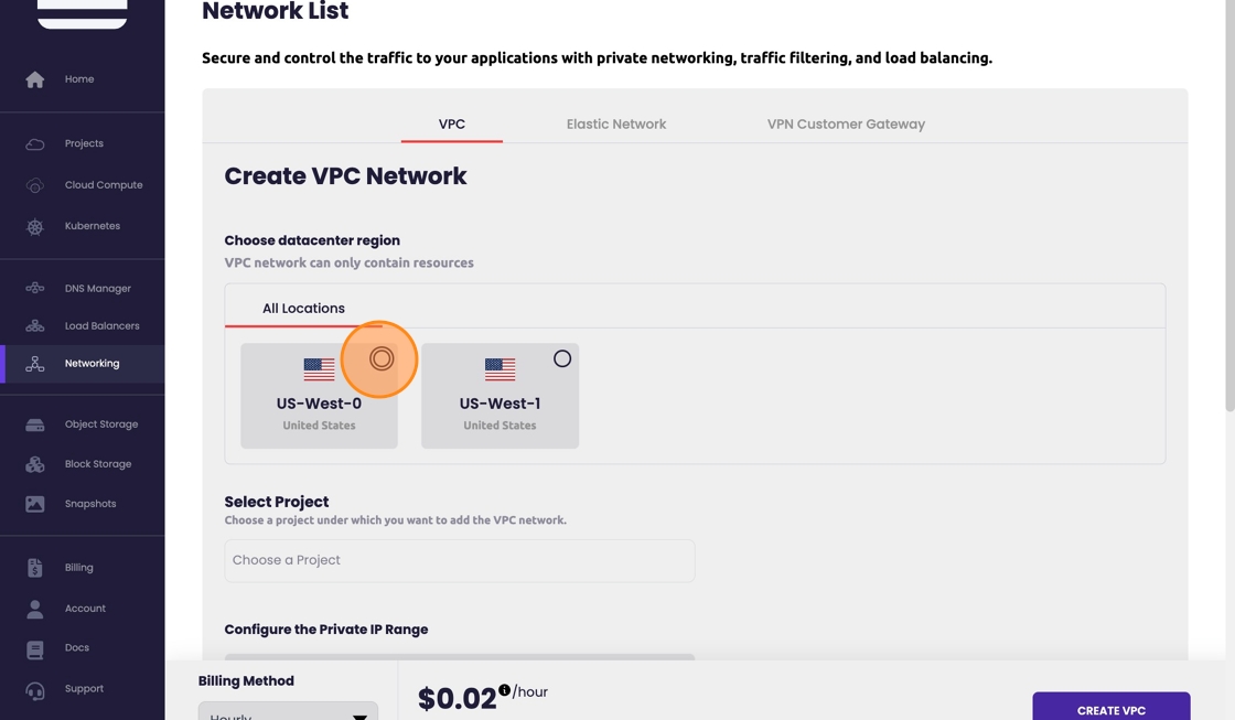 - Determine the zone to create the VPC in. Keeping in mind the premium cluster resides in US-West-0 and only standard clusters reside within US-West-1.