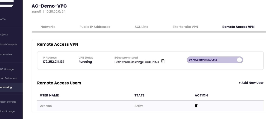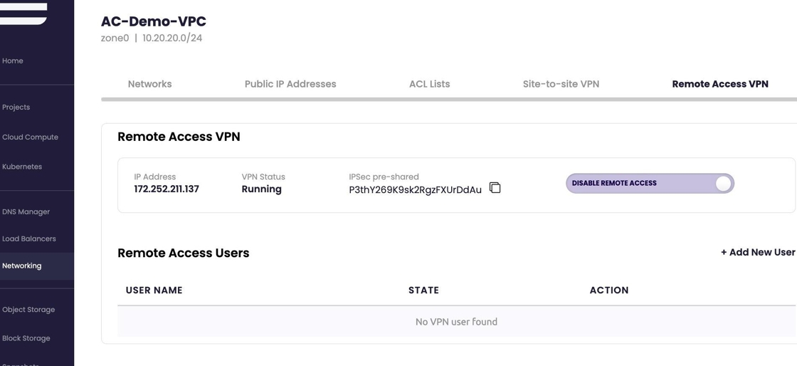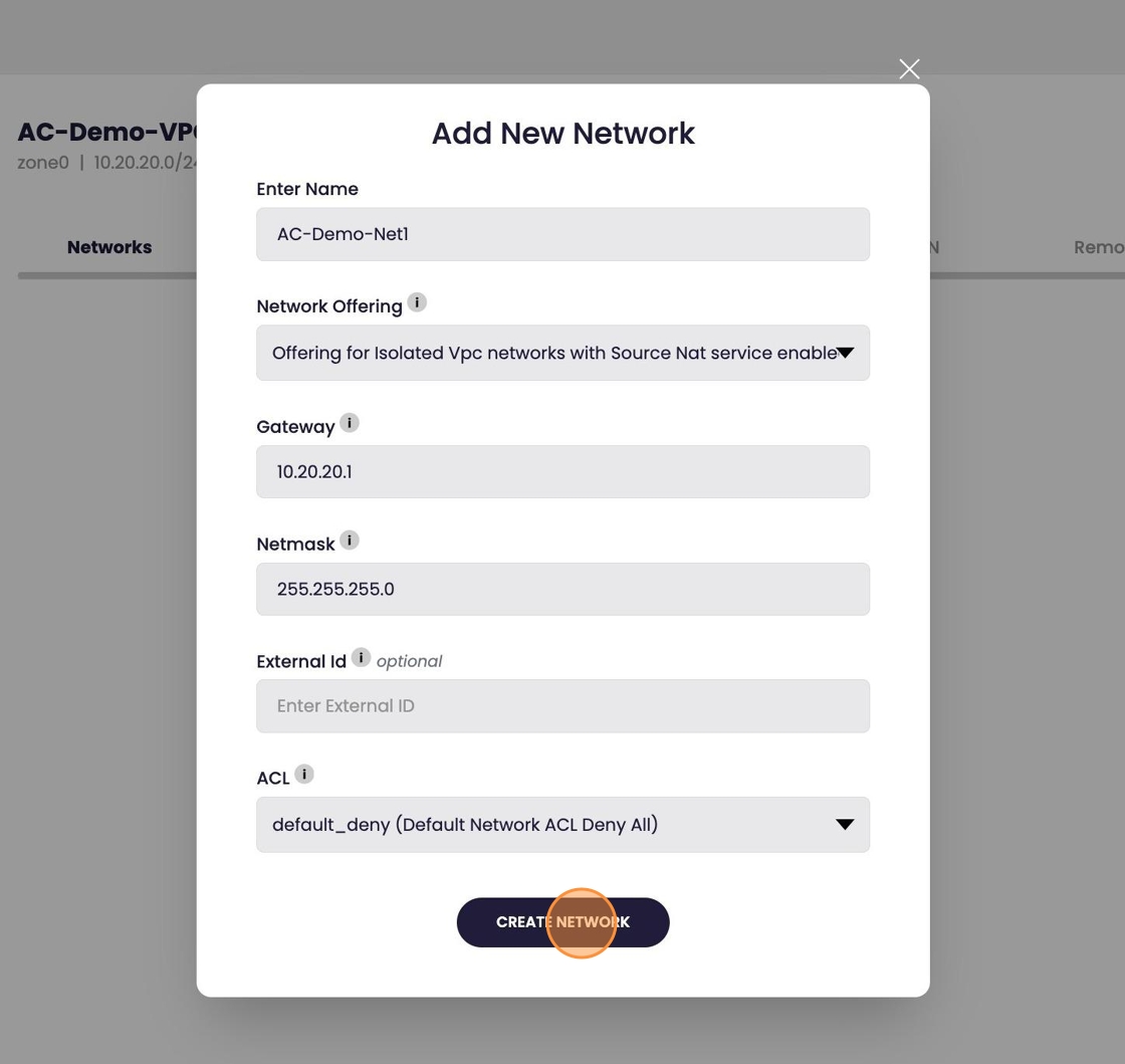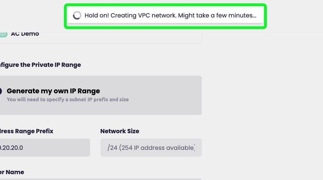 - "Hold on! Creating VPC network. Might take a few minutes..." will appear top of the screen while the VPC is being created.