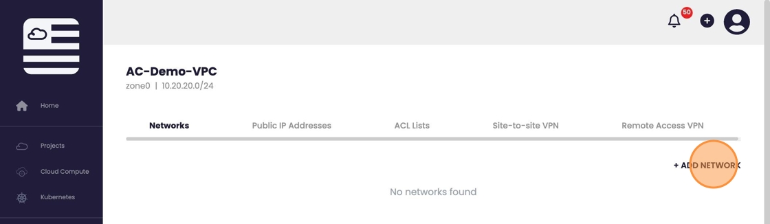 - Once the VPC is created we must add an internal network to being building our environment. Select "+ ADD NETWORK".