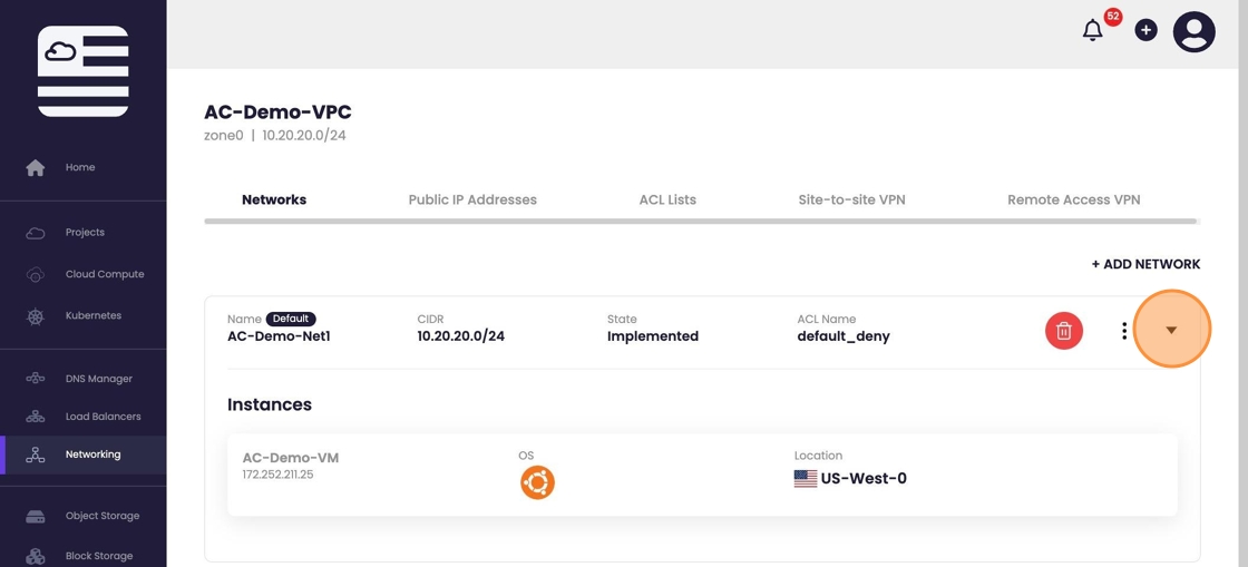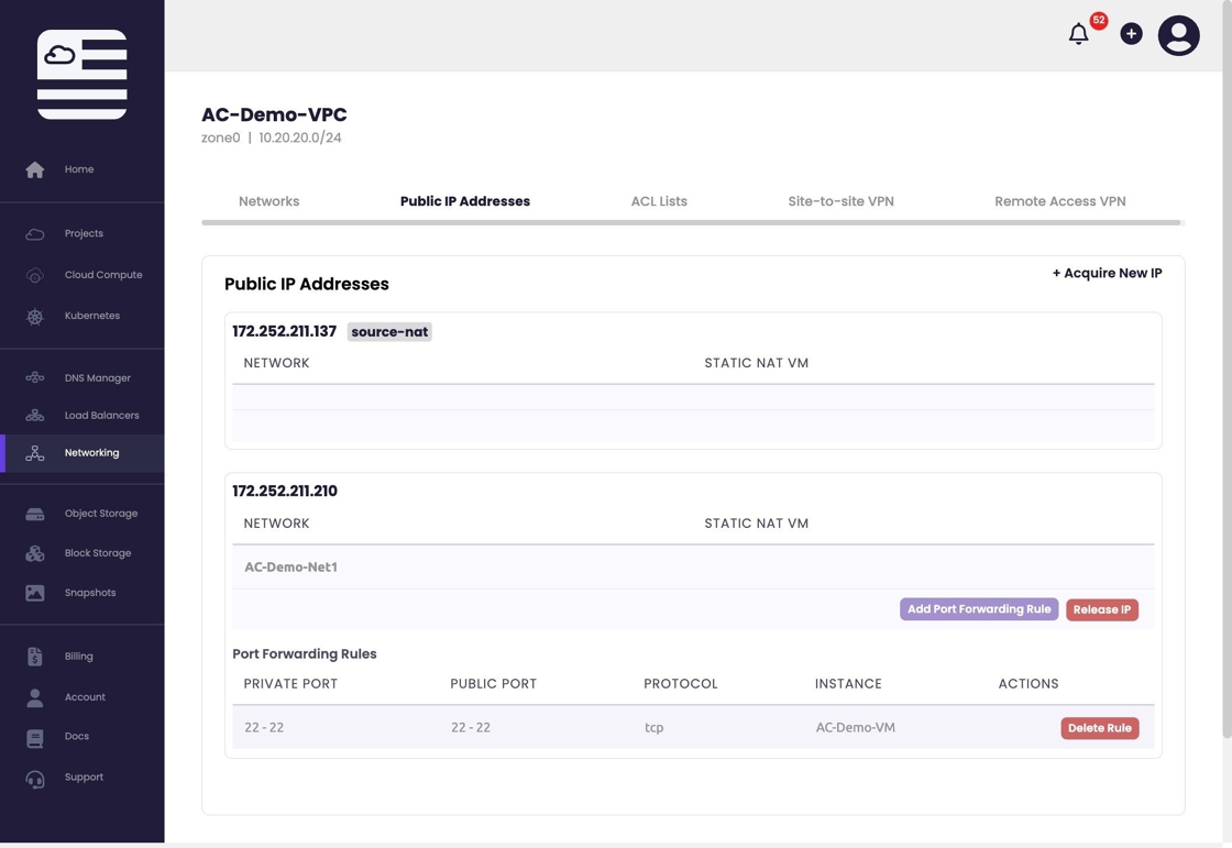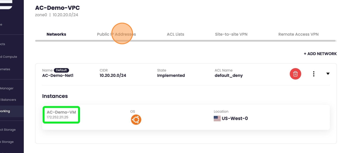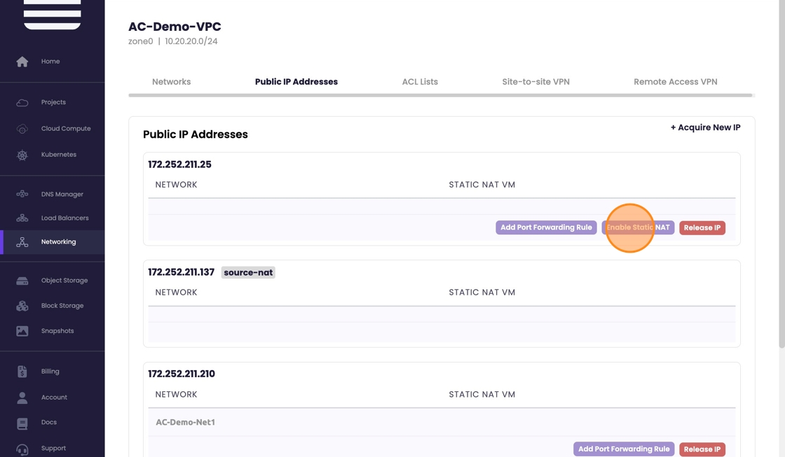 - By listing the instances within the Network, you can see the static nat for the IP has been enabled.
