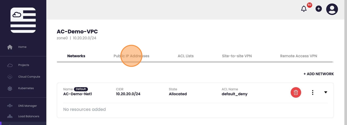 - Select "Public IP Addresses" from the top menu.