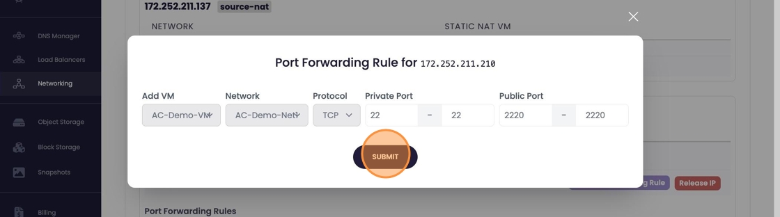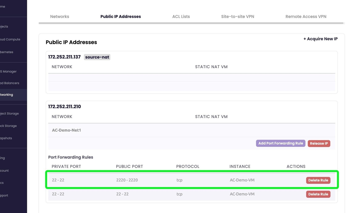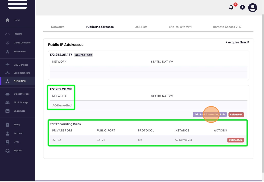 - Add a port forwarding rule by selecting "Add Port Forwarding Rule" on the corresponding IP Address and VM which can be identified in the far left. Already created or active PF rules will be listed below the IP table.