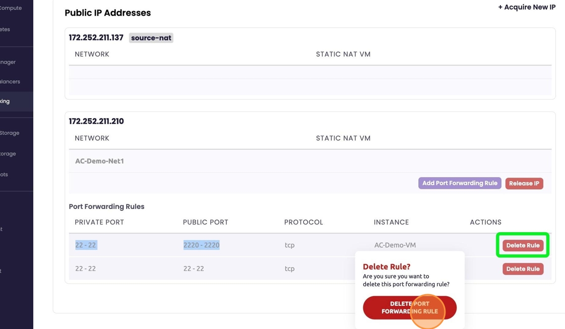 - To delete a PF rule simply select "Delete Rule". A warning block/last chance block will be presented. To proceed with the deletion select "Delete Port Forwarding Rule".