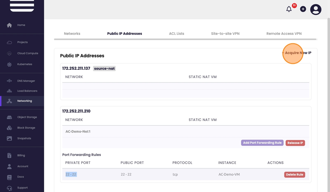 - If another IP Addresses is needed select "+ Acquire New IP".