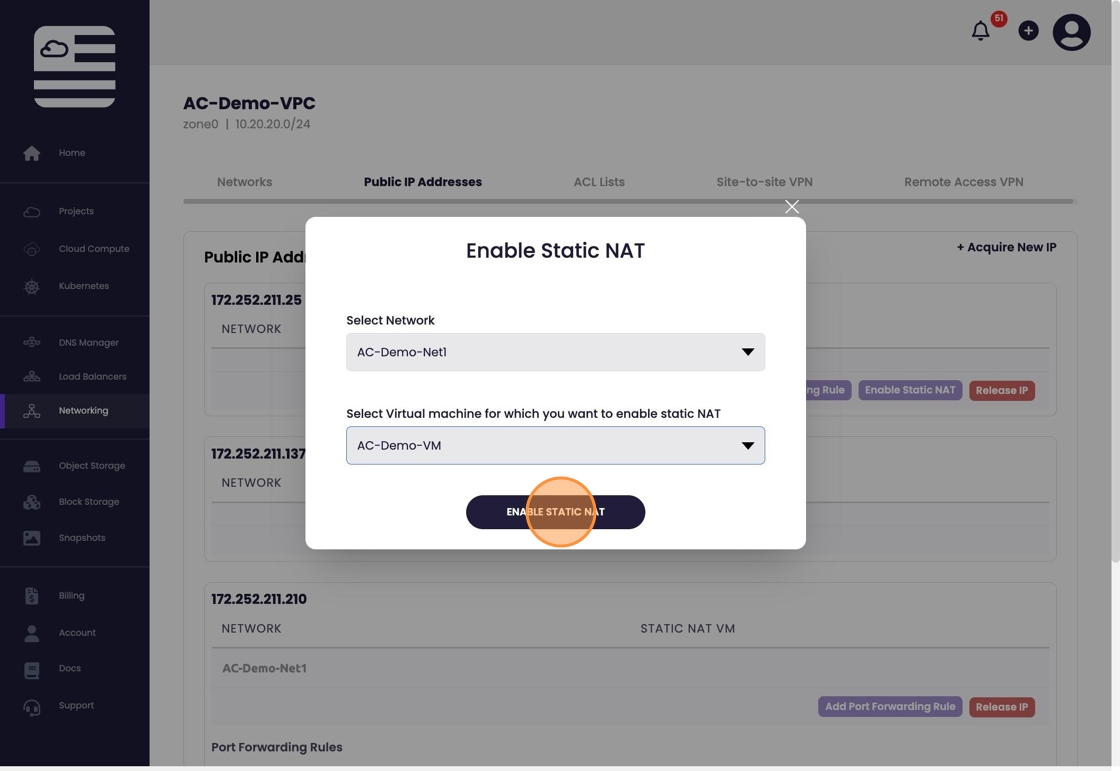 - Select the network and vm to assign static nat to. Select "Enable Static Nat".