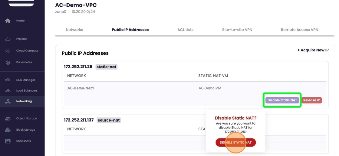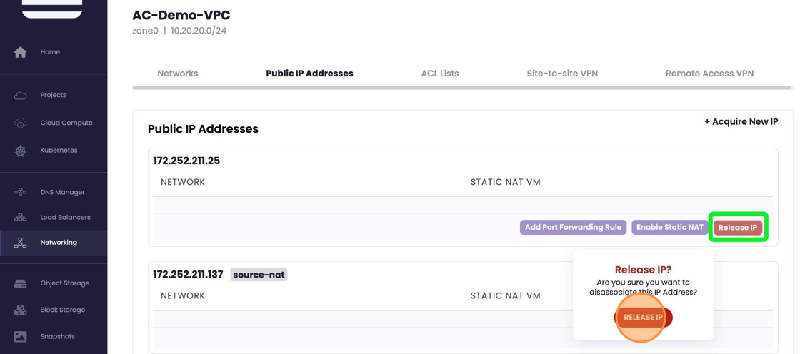 - After disabling static nat, if the IP is no longer required, you can release the IP by selecting "Release IP". A warning/last chance block will appear select "Release IP" to proceed.