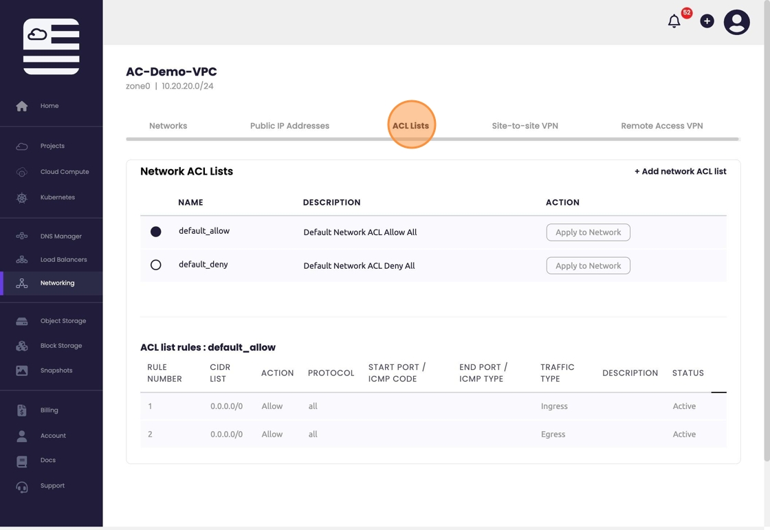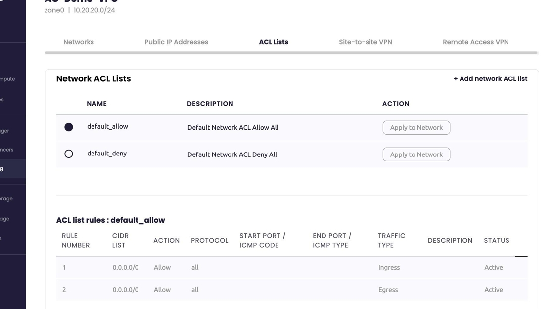Select the default ACL. This field provides the ability to assign a default 'permit-all (default_allow)' or 'deny-all (default_deny)' rule for the new network. Individual exceptions can be configured within the VPC.
