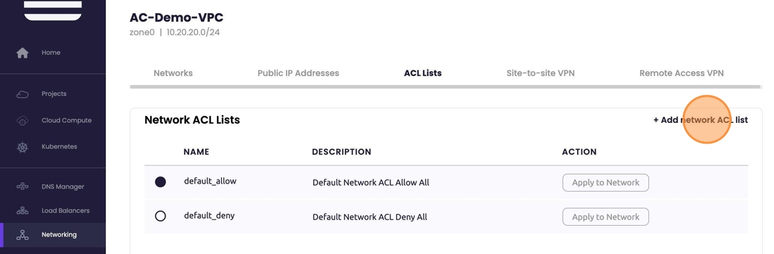 - To create and manage a custom ACL List select "+Add network ACL list".