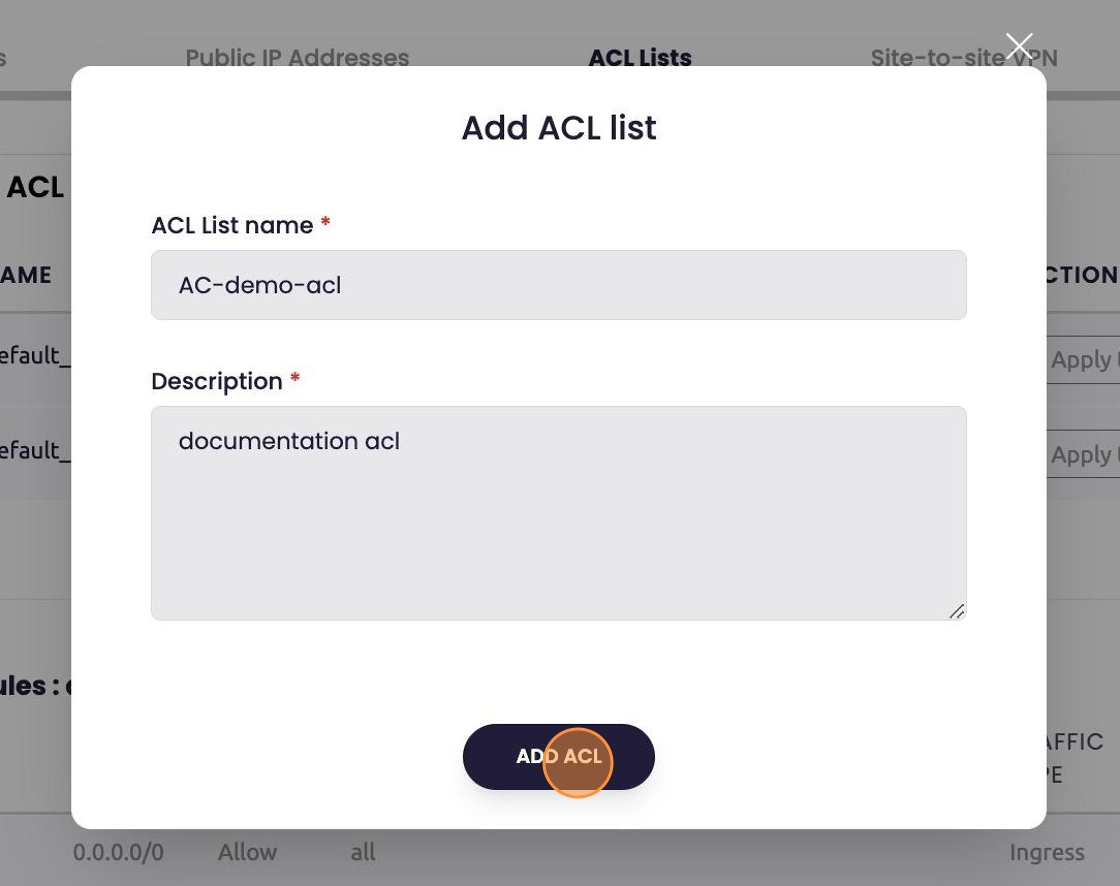 - Provide a name for the list and brief description of your choosing then select "Add ACL"