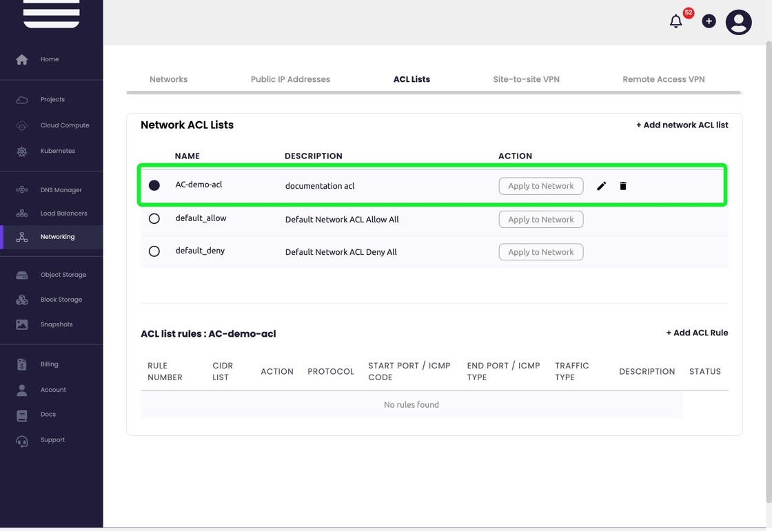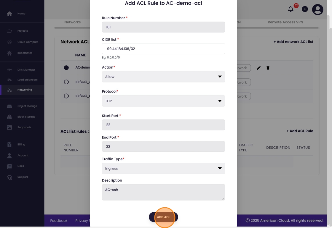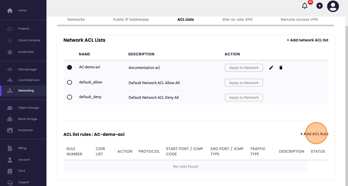 - Once the ACL is created we can add rules by selecting "+ Add ACL Rule".