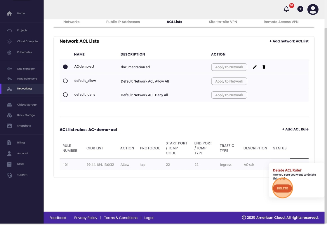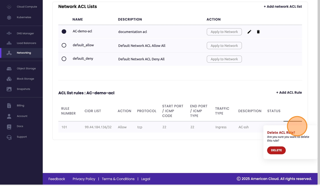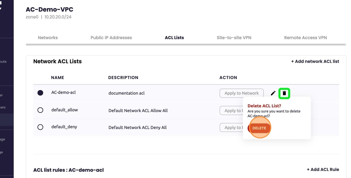 - To delete the ACL List simply select the corresponding trash can icon. A warning/last chance block will present itself. Select "Delete" to proceed.
