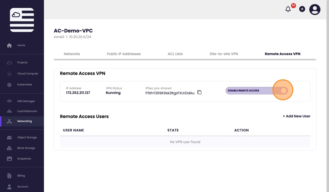 - Once activated the VPN status will read "Running" and display the IPSec pre-shared key needed for connection.