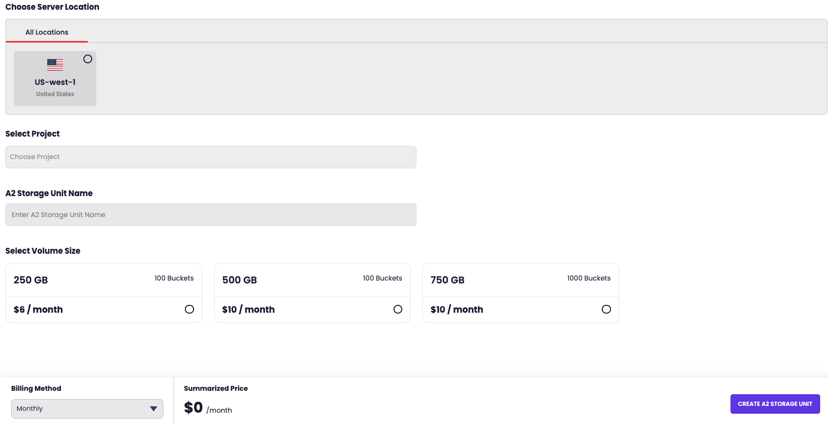 Fill out the provided creation form which allows for full customization of A2 Object Storage. The following fields are available: