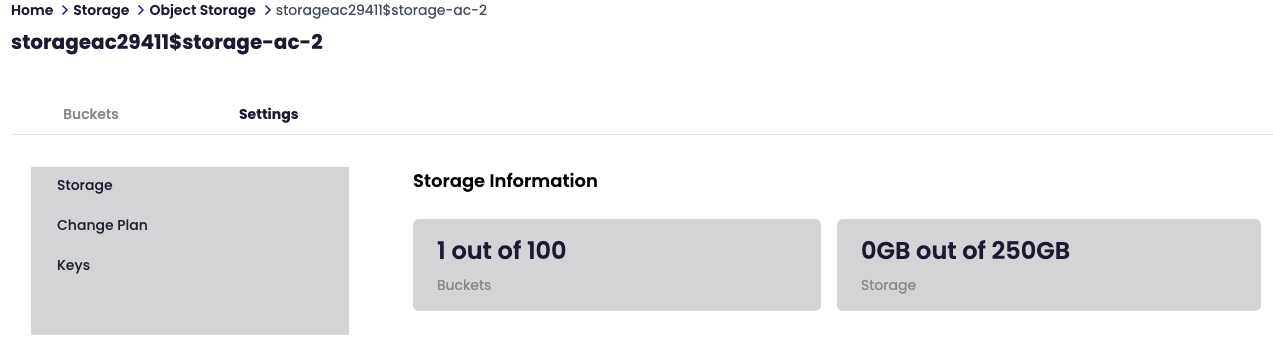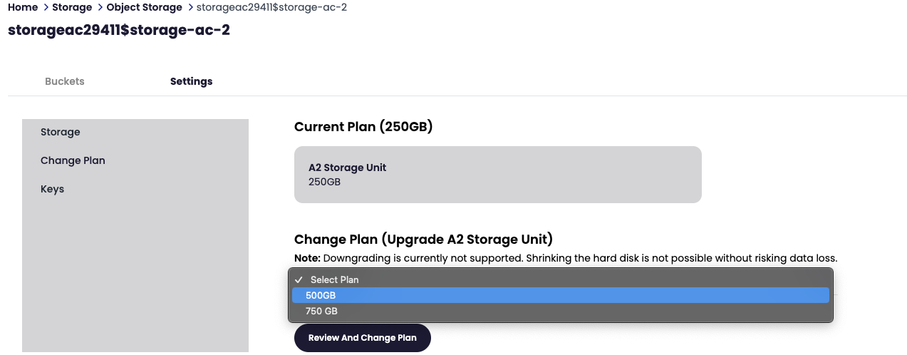 A list of settings will be available. Storage, change plan, and keys