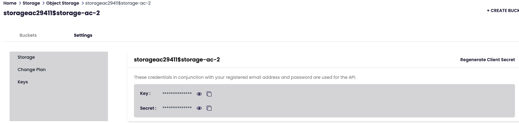 In order to connect via s3cmd the access and secrect are required. In this section we can copy, reveal, or regenerate the keys.