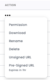 Within the Action Pane, on the far right, are several options per file. Permissions, Download, Rename, Delete, Unsigned URL, and Pre-Signed URL