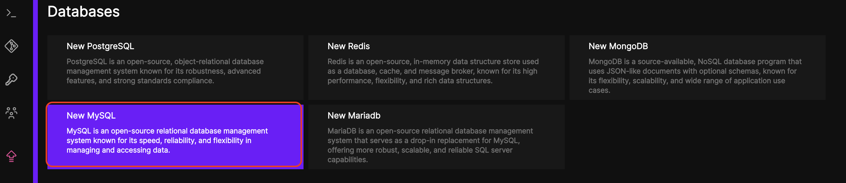 Once the resource list is presented navigate down the page to the databases section. Select 'New MySQL'.