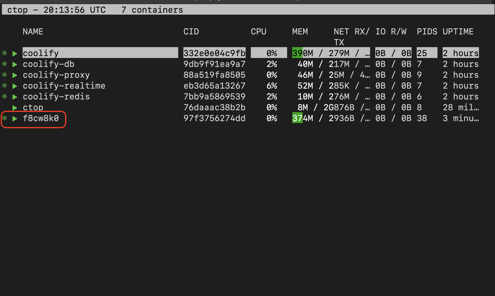SSH into the coolify machine. Run the command sudo docker run --rm -ti --name=ctop -v /var/run/docker.sock:/var/run/docker.sock quay.io/vektorlab/ctop:latest. This will list containers running on the machine. Using the arrow keys scroll to the MySQL resource and press enter.