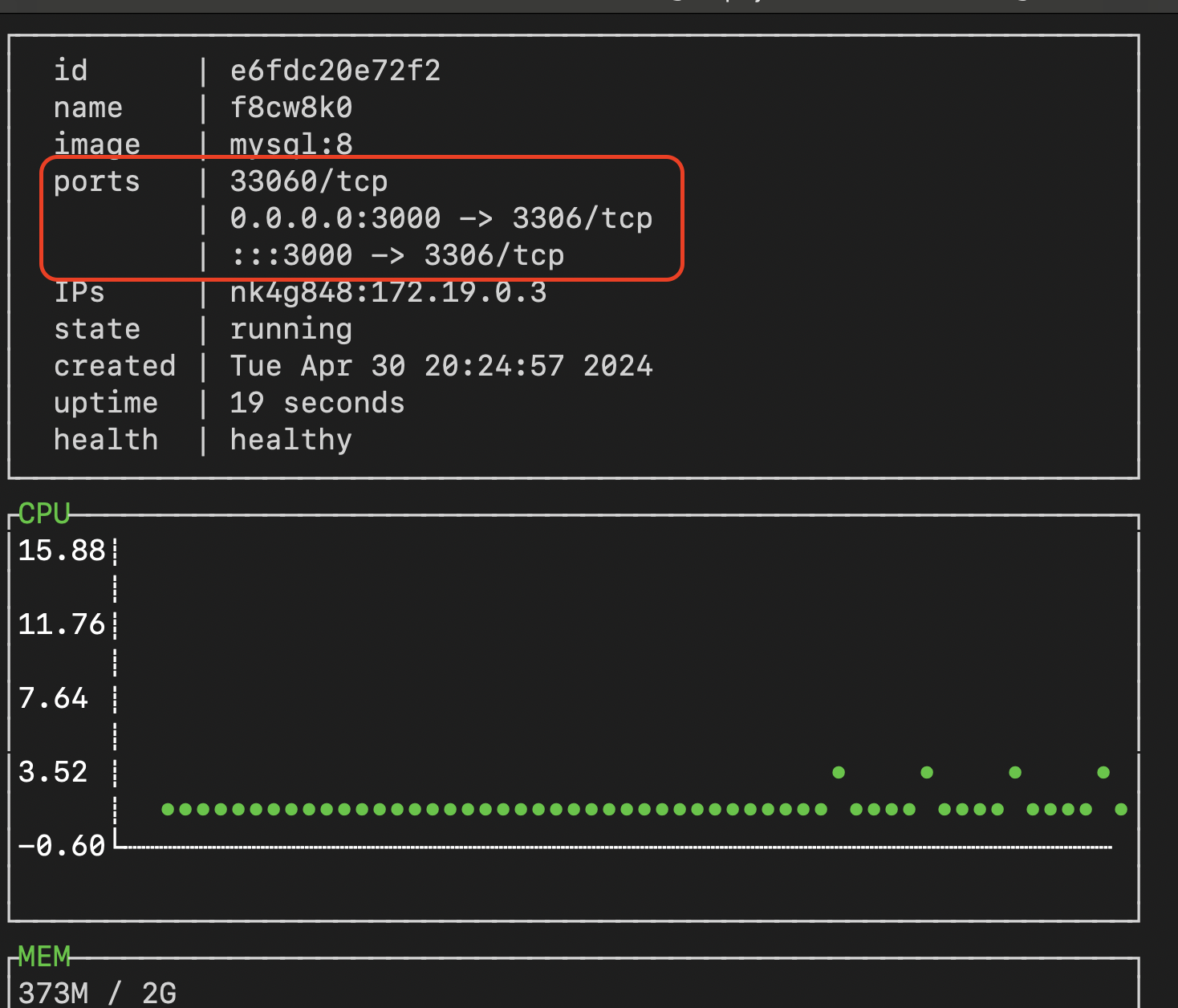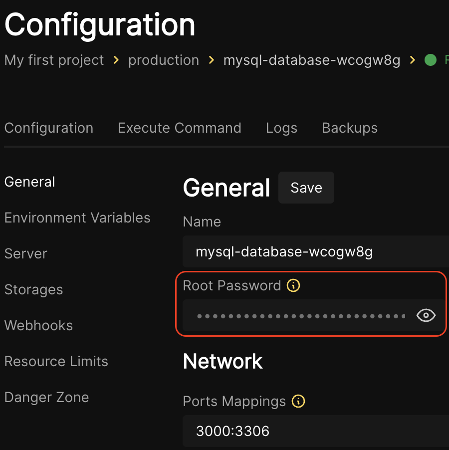Once restared, check the container to ensure ports are configured appropriately by repeating steps 6&7 above. As an example (below), port 3000 is mapped from the local coolify instance to port 3306 if the mysql container.