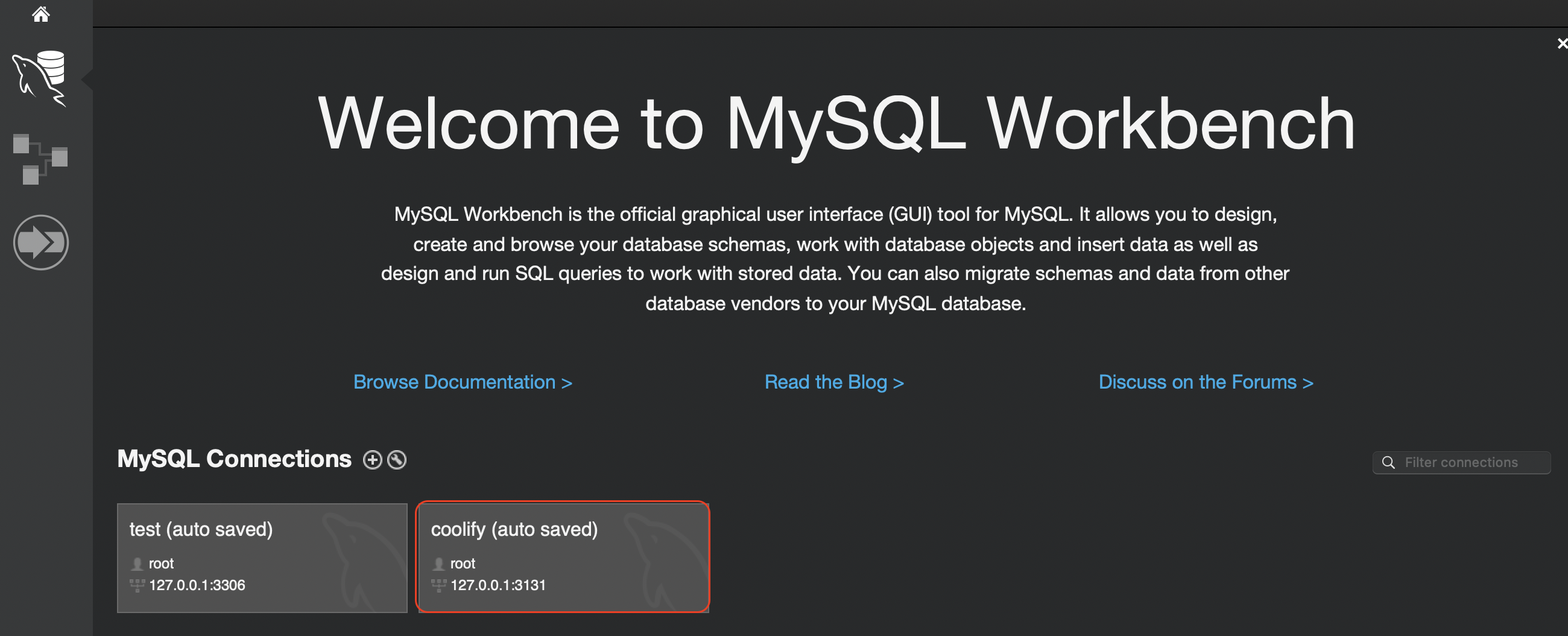 Open MySQL Workbench and select '+' toggle to add a new connection.