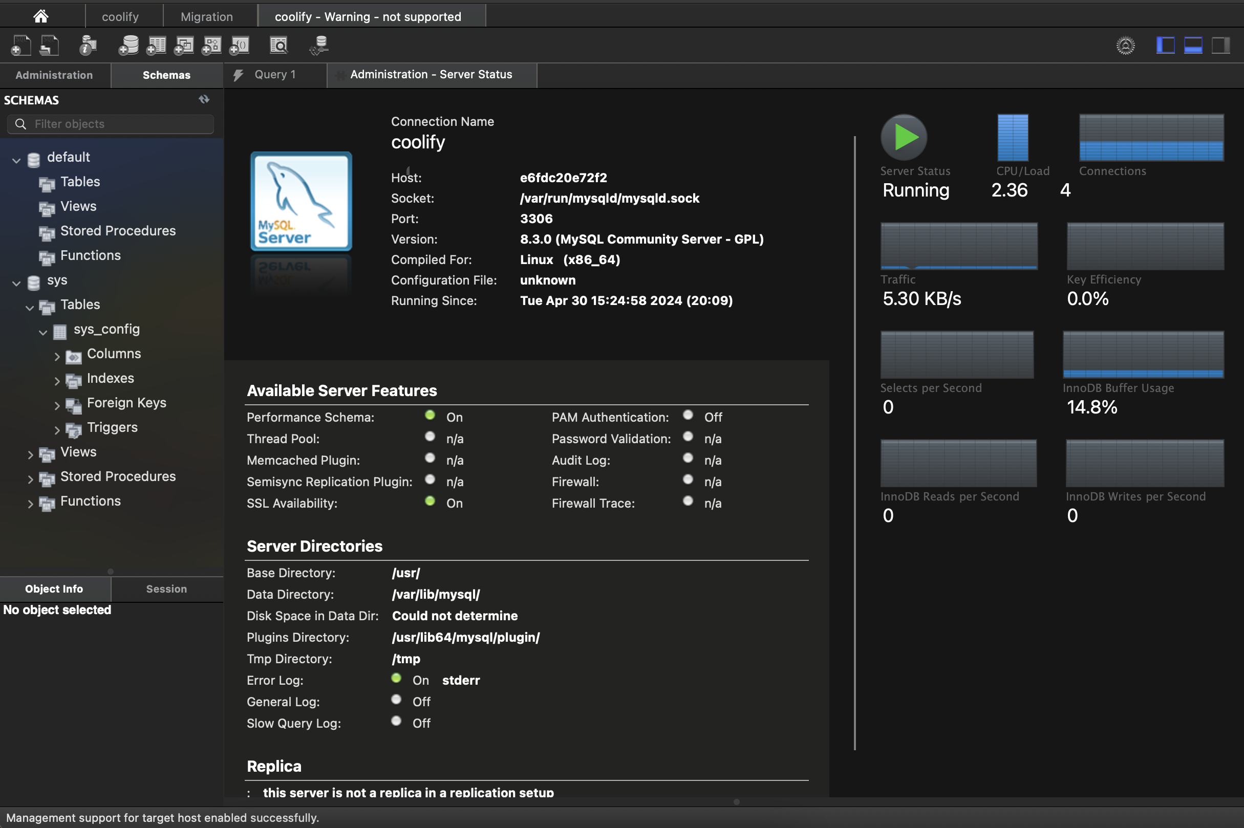 MySQL Workbench is now connected to the Coolify MySQL resource and editable.